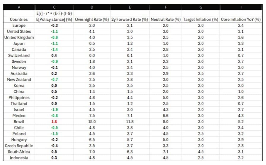 看看颜色标尺:只有一个央行采取紧缩政策(巴西),一些央行采取中性政策(政策幅度在中性上下浮动50个基点),而全球范围内则有大量央行采取宽松政策。在很多情况下,宽松的政策立场源于完全无视通胀目标。