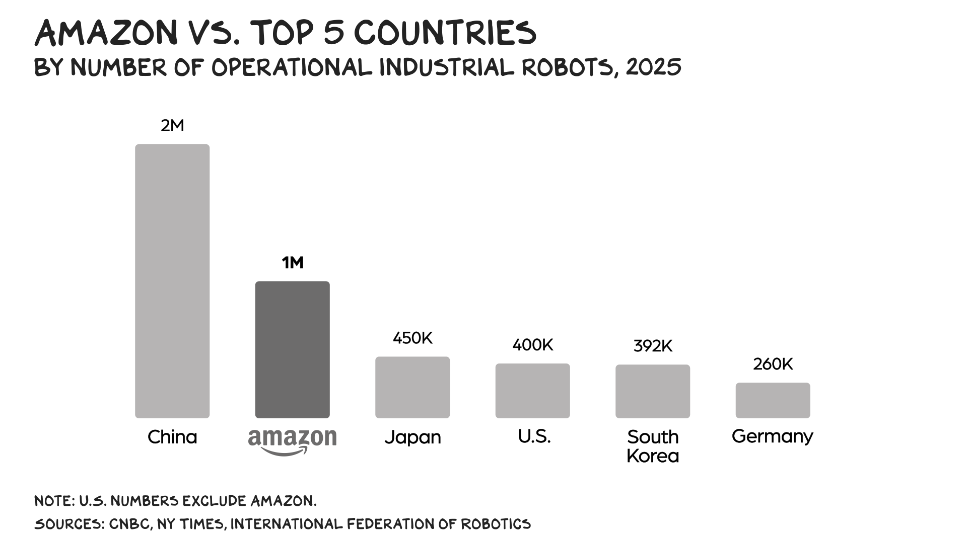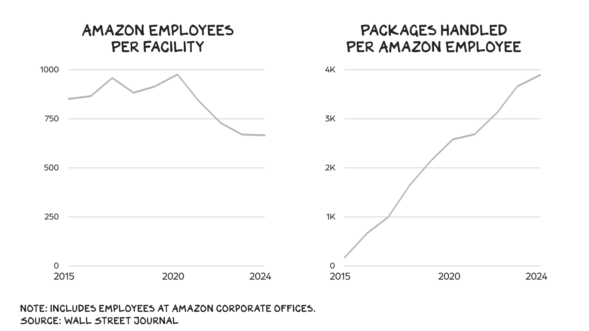 最近,我曾撰文指出,美国经济实际上是在人工智能领域豪赌。这种豪赌推高了那些从事数据处理的公司估值,也分散了人们对那些利用自动化技术减少现实世界摩擦的公司的关注。亚马逊三分之二的收入来自三大业务板块:线上零售、实体店以及为第三方卖家提供的物流服务。这些业务占亚马逊运营支出的三分之一——仅上个季度就高达260亿美元。亚马逊的自动化程度越高,就越能通过减少现实世界的摩擦来降低核心业务的成本。这种情况已经出现。据《 华尔街日报》报道,亚马逊去年平均每个物流中心约有670名员工——这是16年来的最低数字。与此同时,这些员工现在平均处理的包裹数量是十年前的22倍。