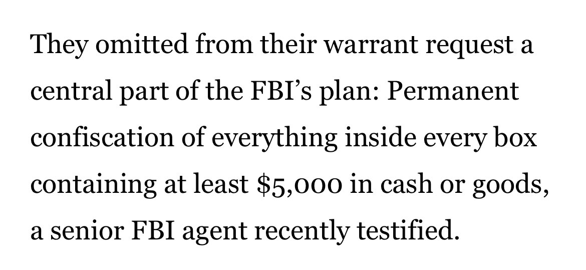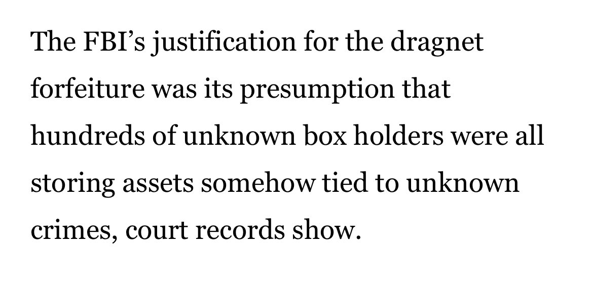 原推:So the FBI indiscriminately confiscated $86 million from 1,400 safety deposit boxes because it presumed an unknown number of unknown box holders were storing assets tied to unknown crimes?