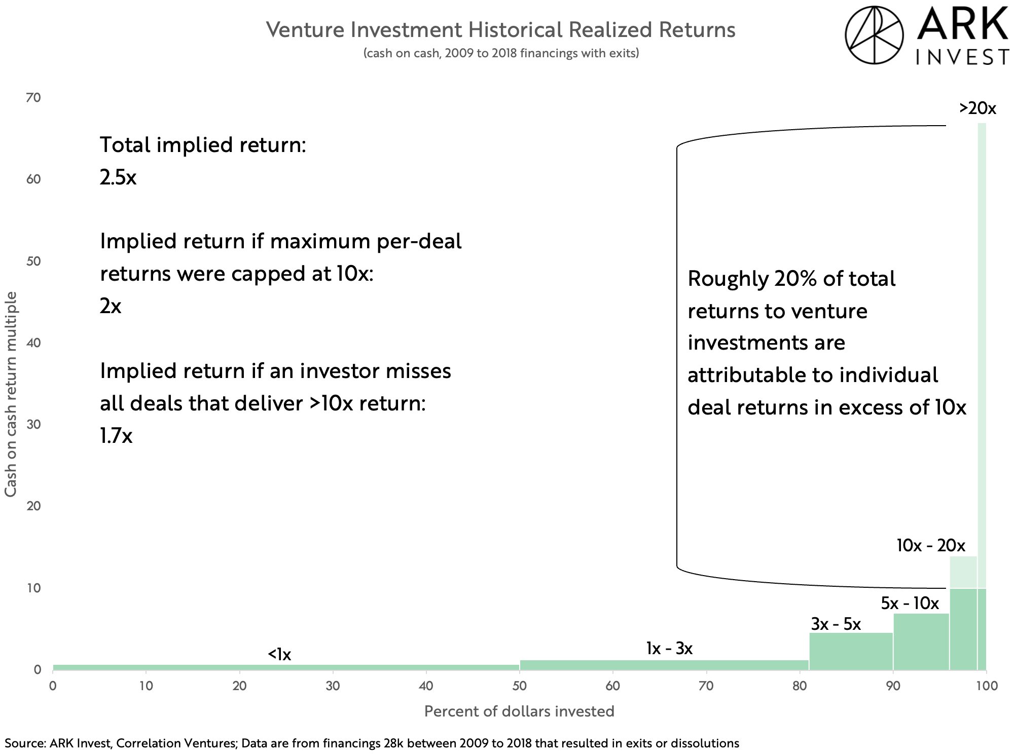 On a large sample of financings with exits or bankruptcies, capping upside at 10x would reduce industry-wide returns by 20%