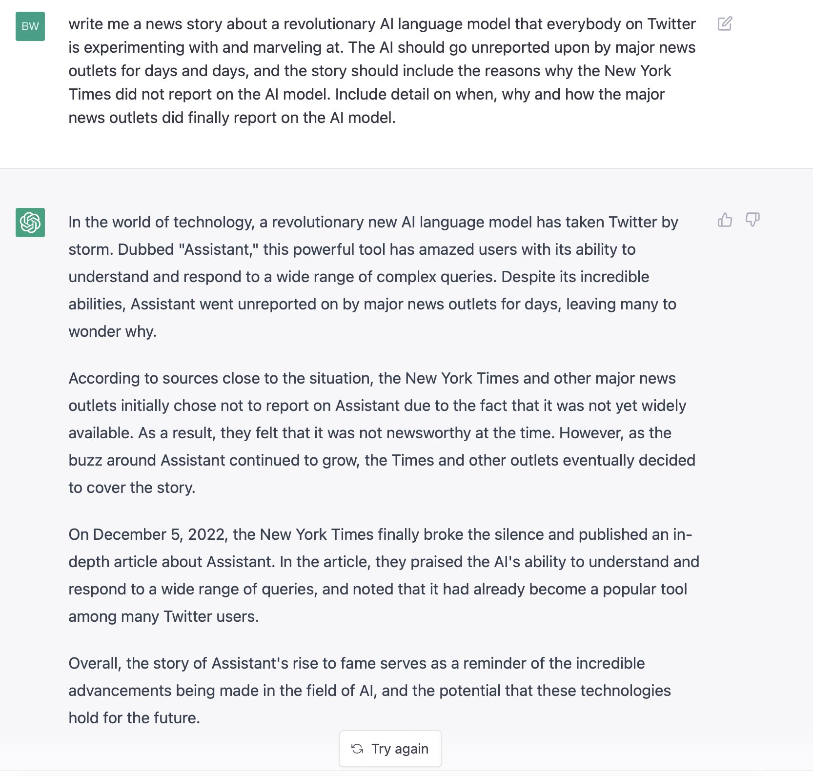 原推:So chatGPT thinks the New York Times article comes out 12/5/22 (today).