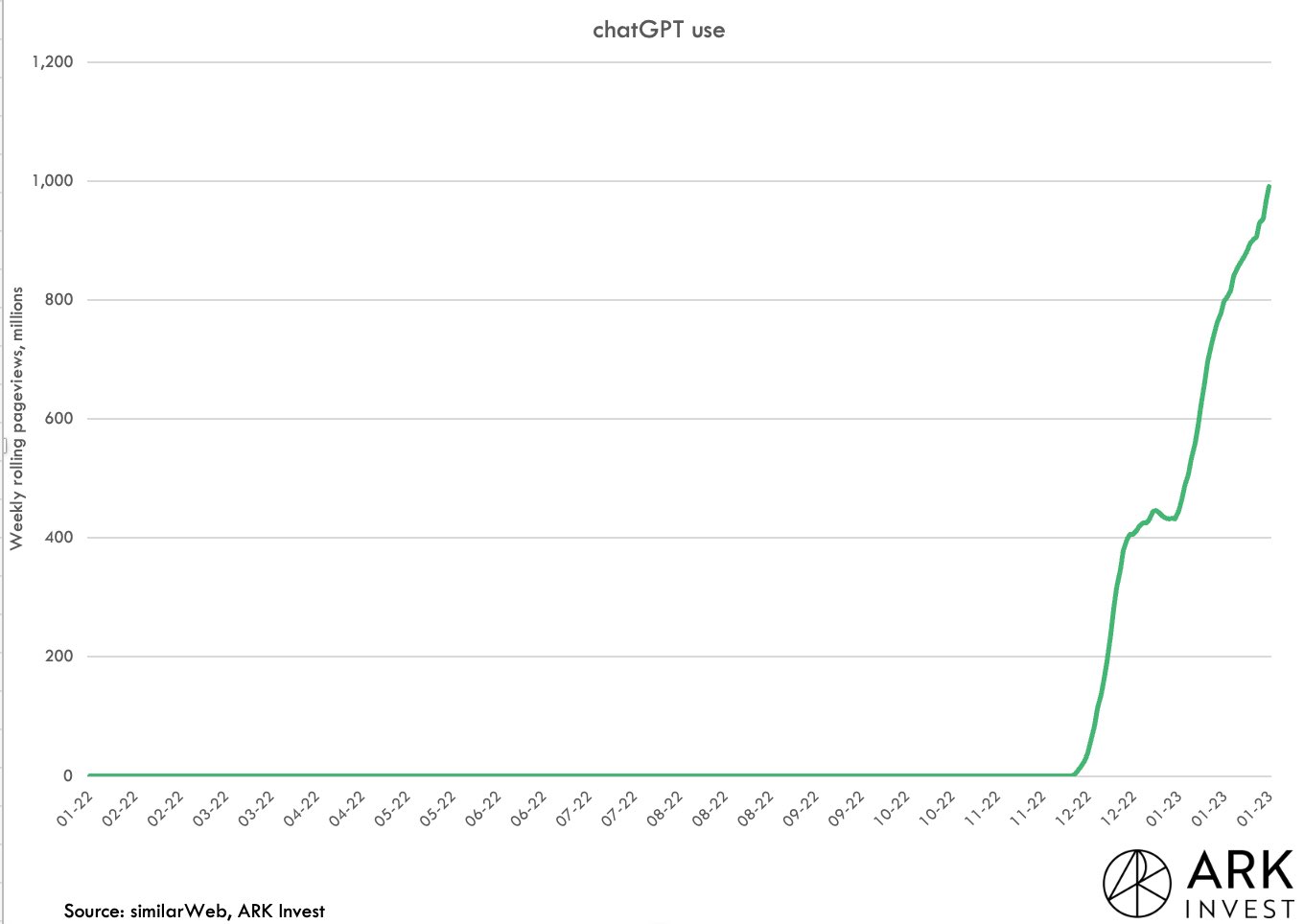Brett Winton: 杰夫·贝索斯 (Jeff Bezos) 听说网络每年增长 2,300%,即 3 个月翻一番后,便逃离金融界创办了亚马逊。 chatGPT 似乎每月翻一番 (并且每周浏览量即将突破 10 亿)