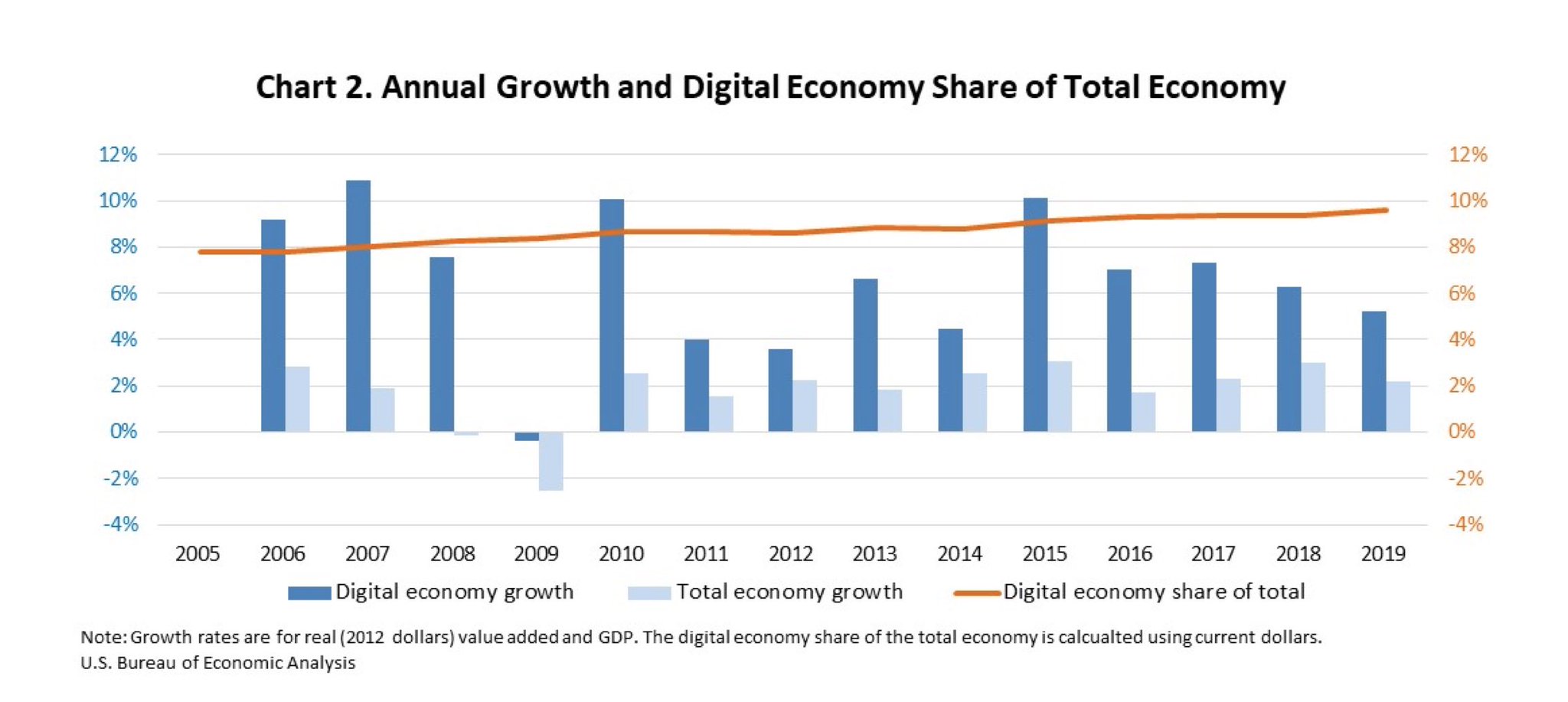 原推:The BEA has tried to capture the divergence and measures the digital economic output as outpacing non-digital by 5 percentage points per annum and making up 10% of overall GDP (as of 2019)
