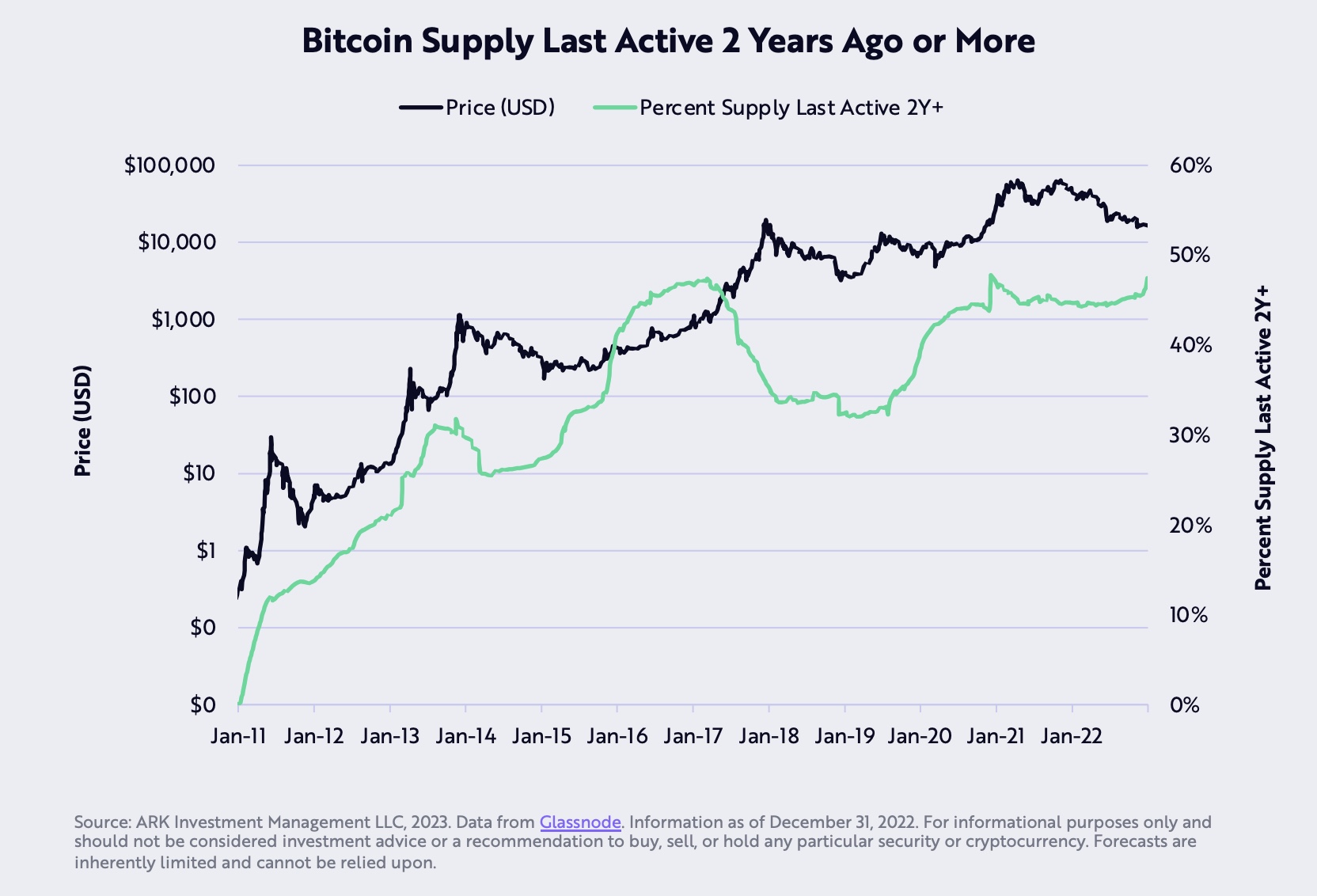 1/ Nearly half of bitcoin’s supply hasn’t moved in over 2 years, headed to an all-time high.