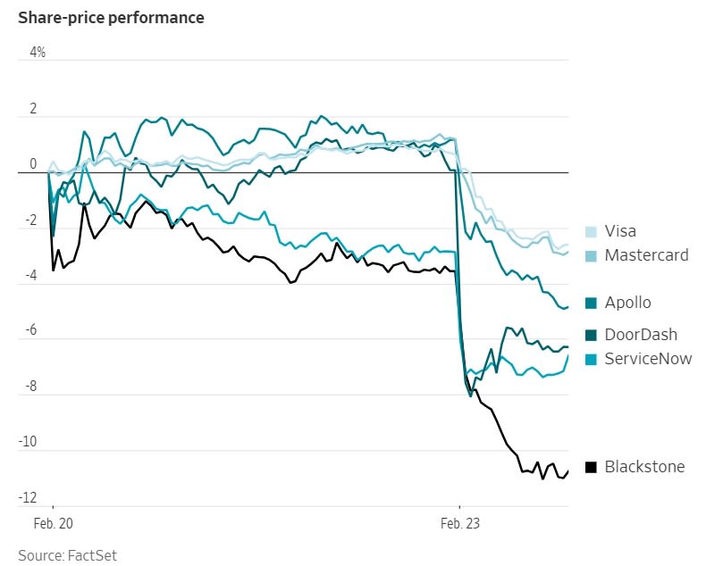 我其实并不关心这场微观经济之争,因为坦白说,我对相关行业和就业岗位都缺乏专家级的了解。不过,看到市场对西特里尼文章的反应确实很有意思。一大批软件和金融类股票下跌,其中包括西特里尼点名提到的许多公司: