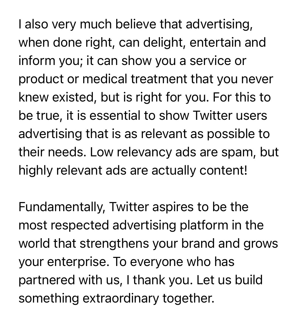 Elon Musk: 亲爱的 Twitter 广告商 Posted on 2022-10-27 原推:Dear Twitter Advertisers https://twitter.com/elonmusk/status/1585619322239561728
