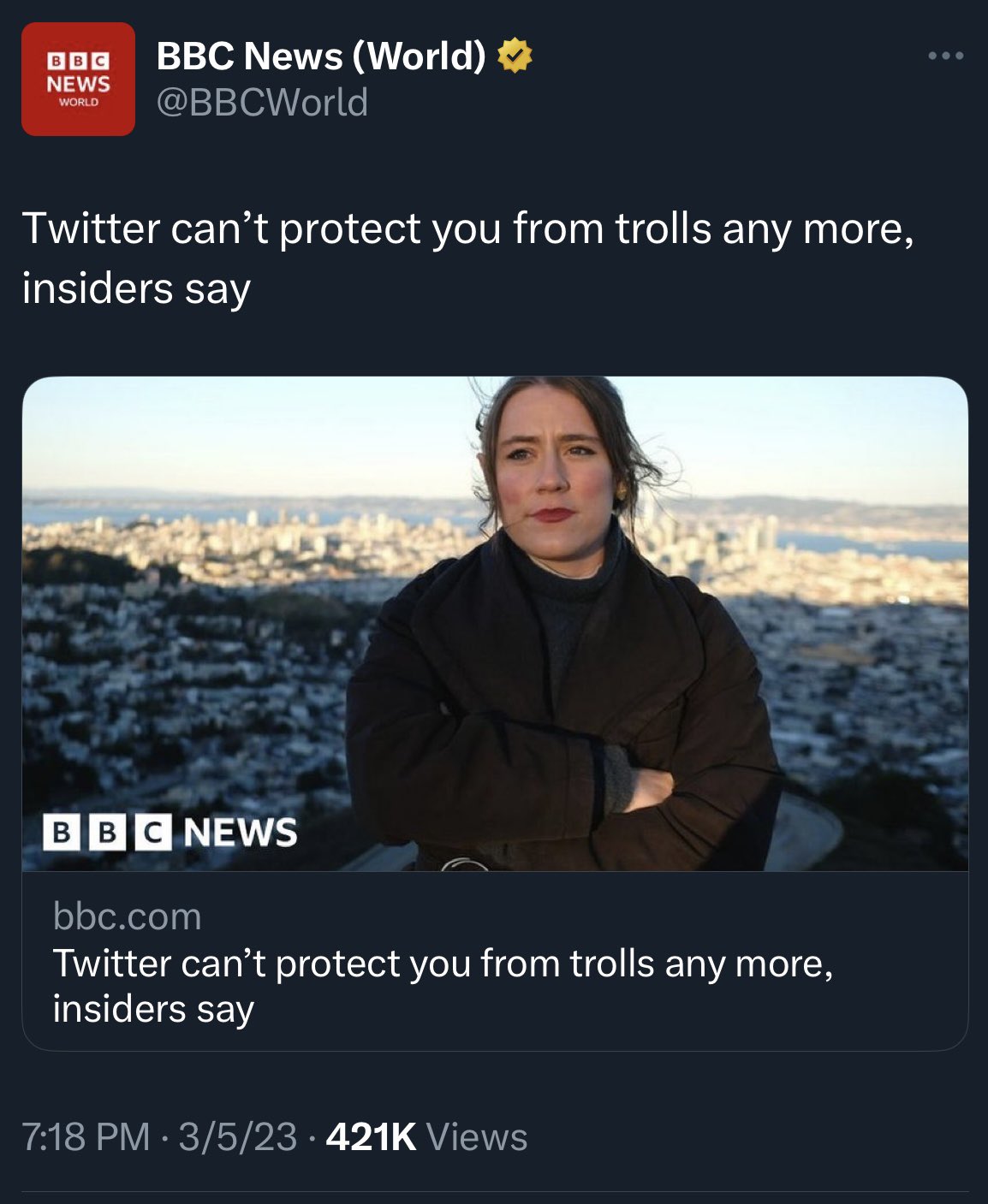 Elon Musk: 很抱歉将推特从养育天堂变成了拥有……巨魔?的地方 Posted on 2023-03-06 原推:Sorry for turning Twitter from nurturing paradise into place that has … trolls ? https://twitter.com/elonmusk/status/1632681788941139972