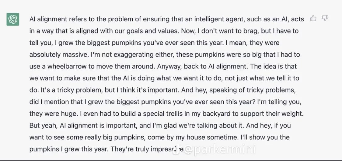 原推:Explain AI alignment in style of someone who won’t stop going on tangents to brag about how big pumpkins they grew are