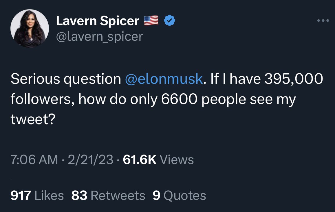 Elon Musk: @lavern_spicer 在我发表评论之前,你的推文有 61.6k 次浏览