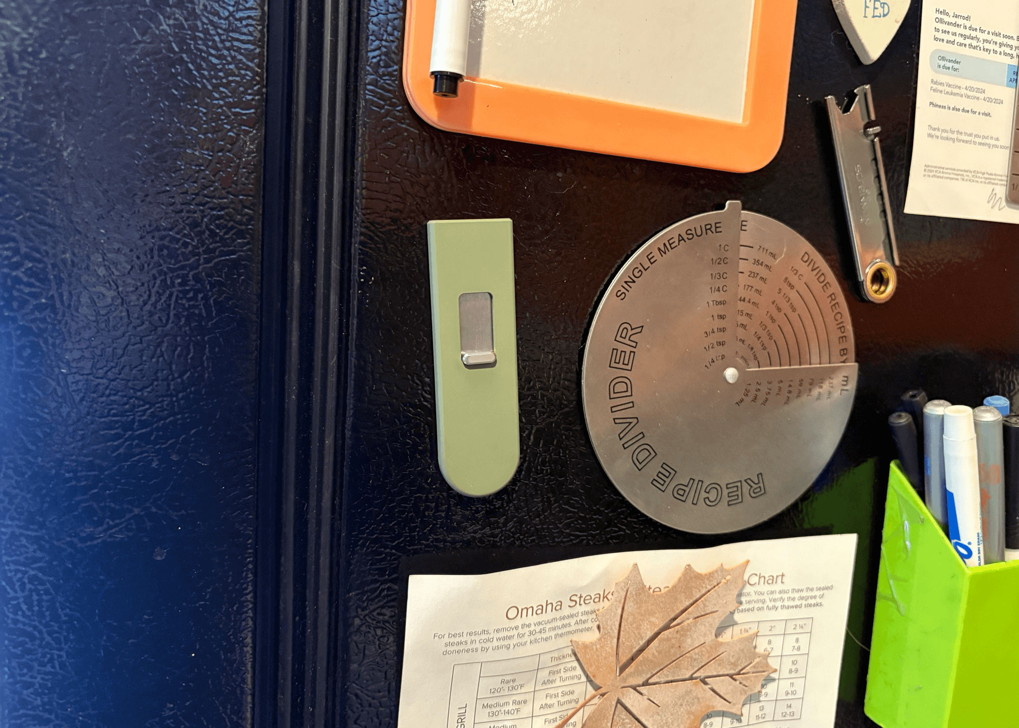 冰箱门上附有几件物品。其中包括一块带有记号笔的磁性干擦板、一个带有公制和茶匙转换功能的圆形金属配方测量分隔器,以及一把绿色的 Keen 美工刀。还有一张写有牛排烹饪说明的纸,用叶形磁铁固定。绿色支架的右侧包含一些干擦标记。准备好行动了。从来没有丢在抽屉里。 ⌘