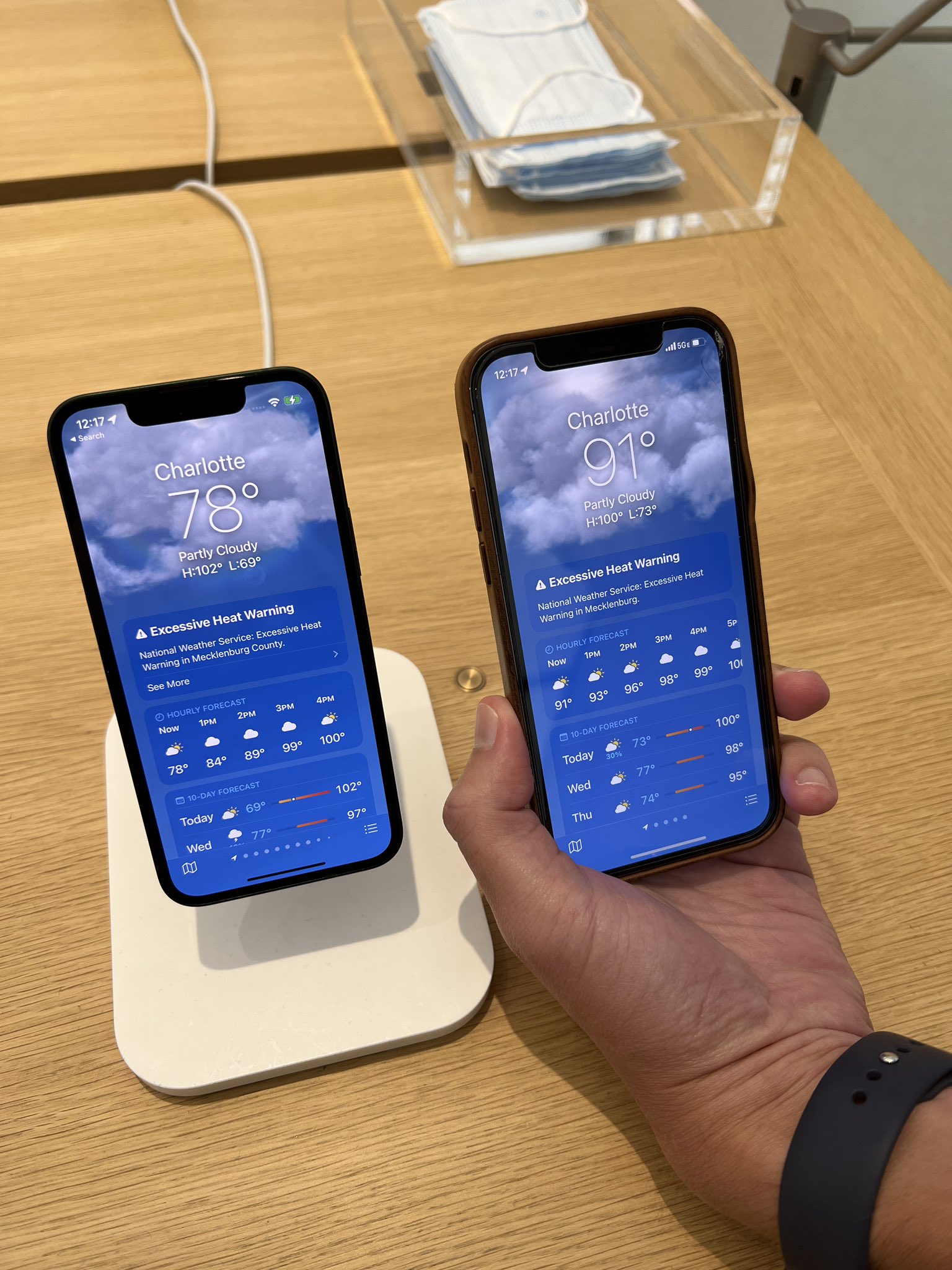 Weather app in iOS 16 (right) seems to use a wildly different (and wrong) model than iOS 15 (left). I can confirm by walking outside that it is not 91 degrees.