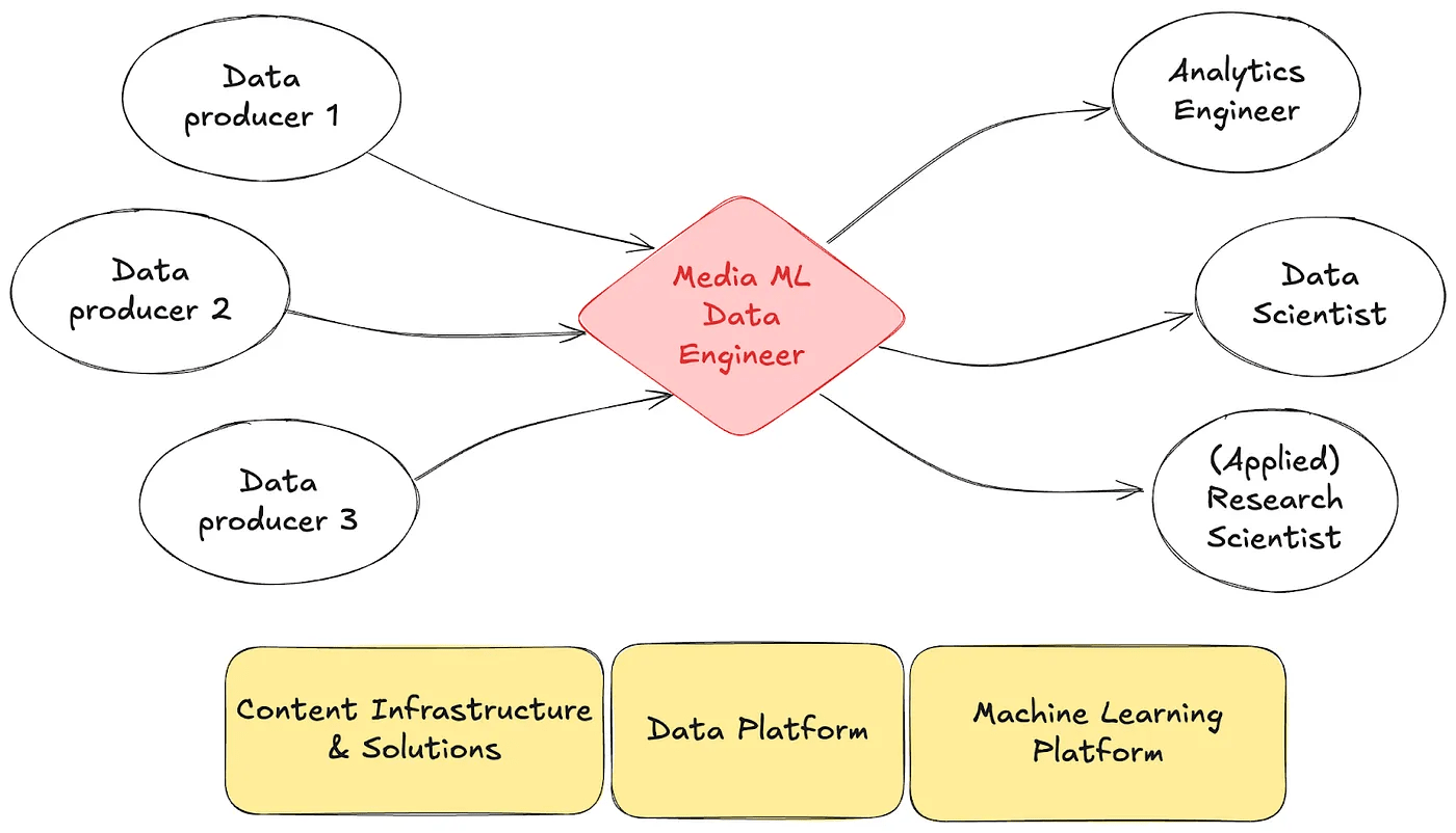 不同的数据生产者将他们的数据发送给媒体机器学习数据工程师,然后数据工程师将其提供给分析、数据科学和应用人工智能。