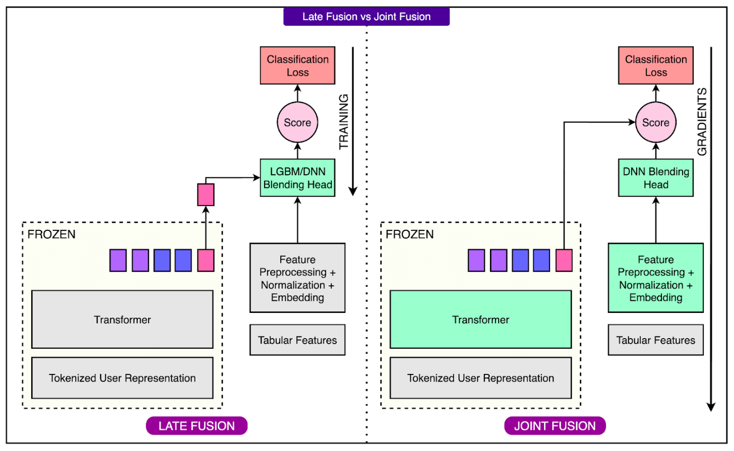 • Late Fusion 使用 LightGBM 等模型来结合嵌入和表格数据,但两者是分开训练的。