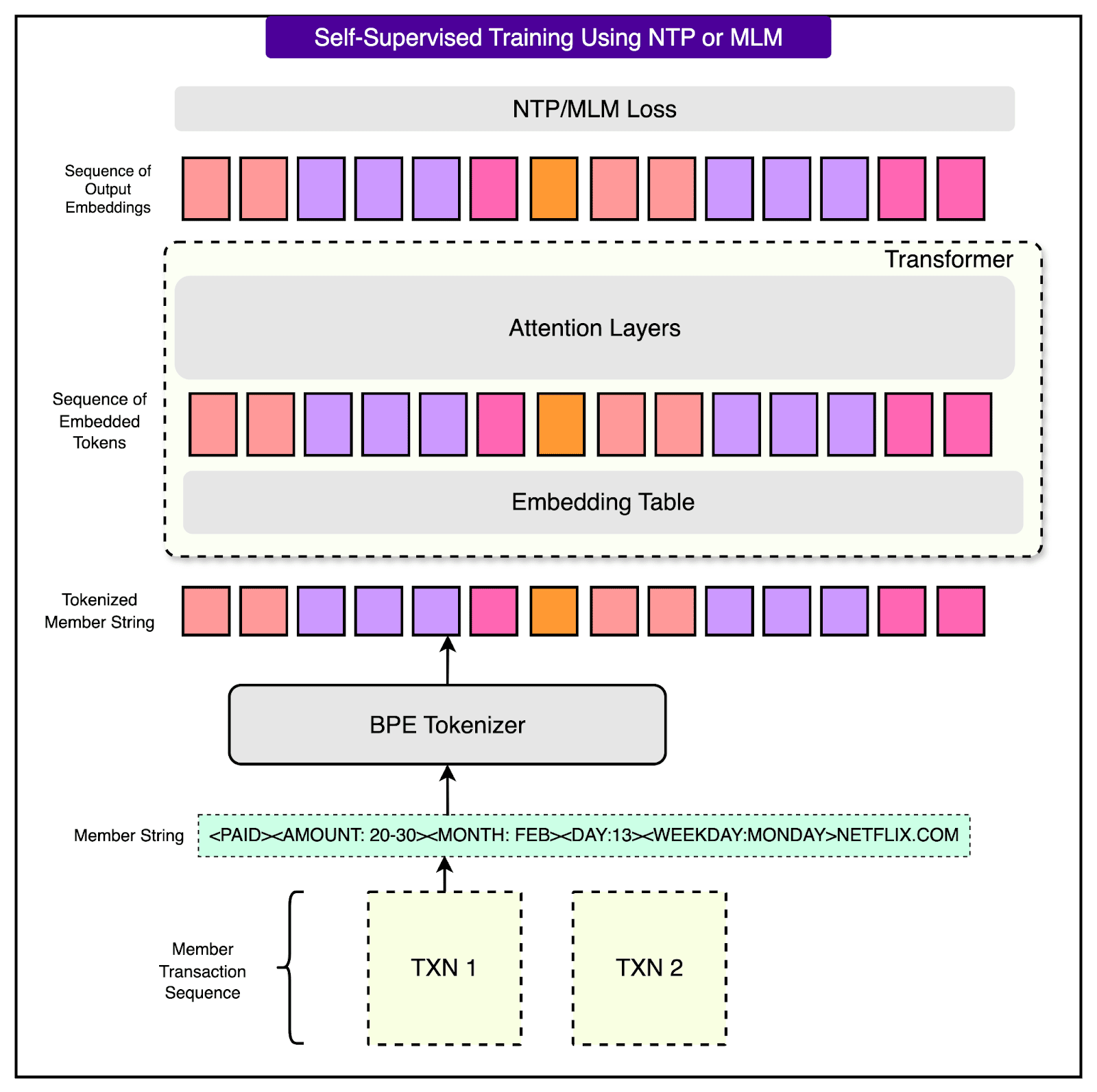 • 掩蔽语言模型 (MLM),其中交易序列的部分内容被隐藏,模型必须对其进行预测。