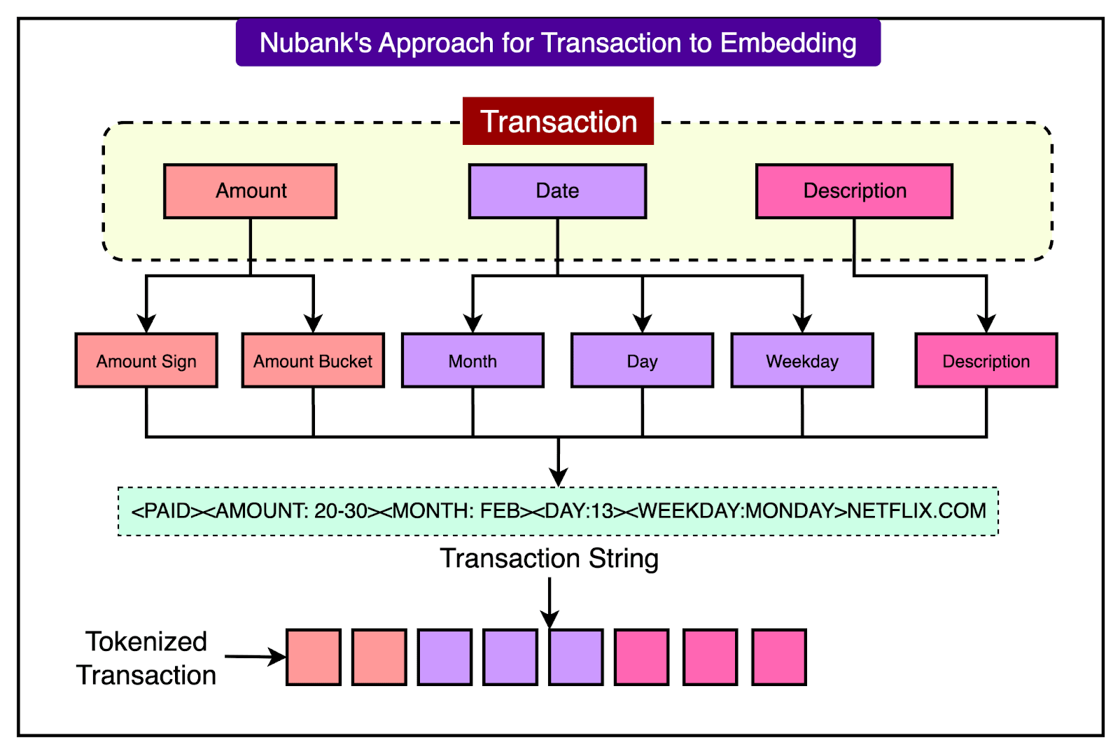 该方法将每笔交易视为一段自然语言文本。交易字段通过连接属性名称及其值转换为字符串,例如“description=NETFLIX amount=32.40 date=2023-05-12”,然后使用标准 NLP 分词器进行分词。