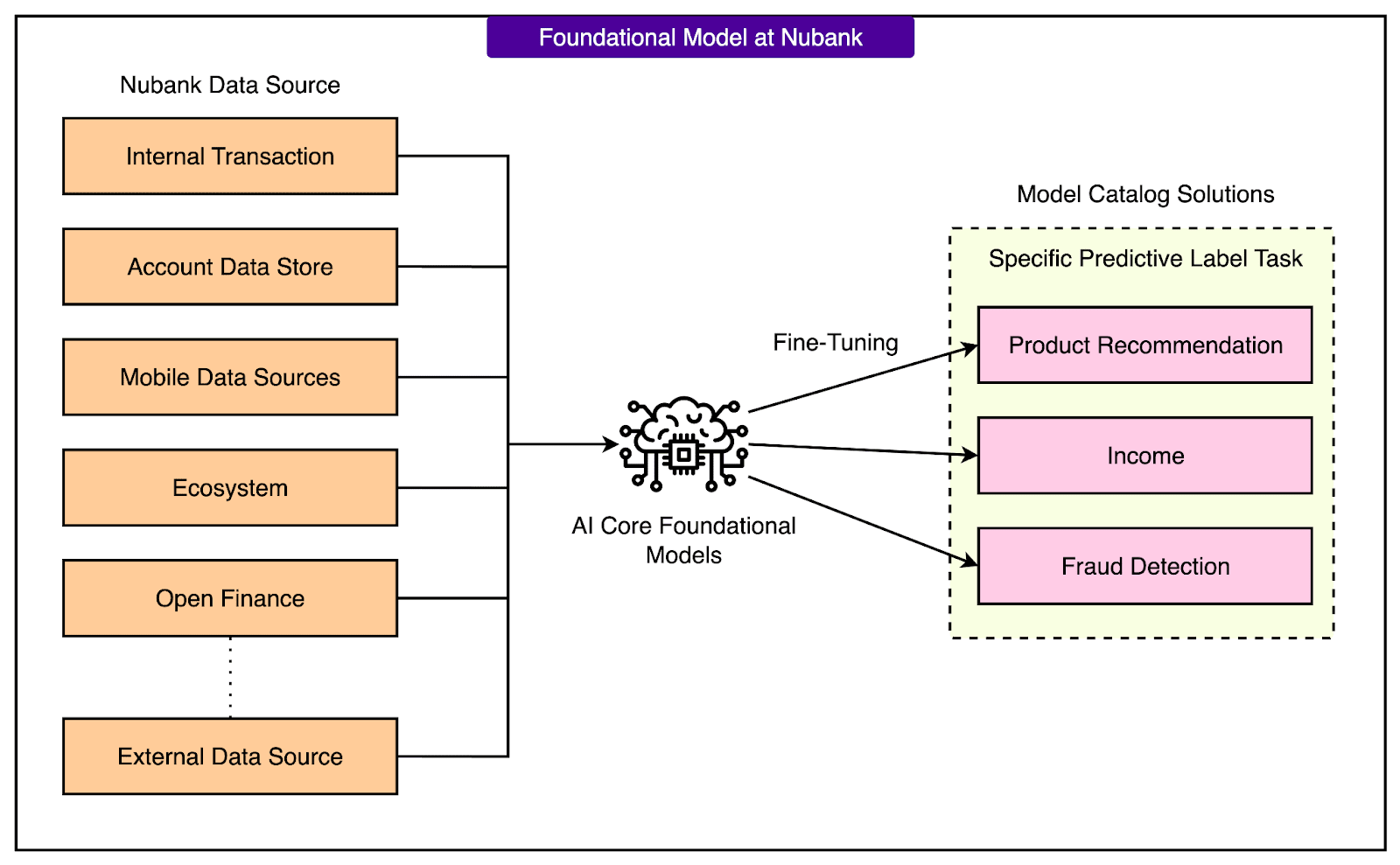 Nubank 的基础模型系统旨在处理海量金融数据,并从中提取通用的用户表征。这些表征(也称为嵌入)随后将应用于信用评分、产品推荐和欺诈检测等众多商业应用。