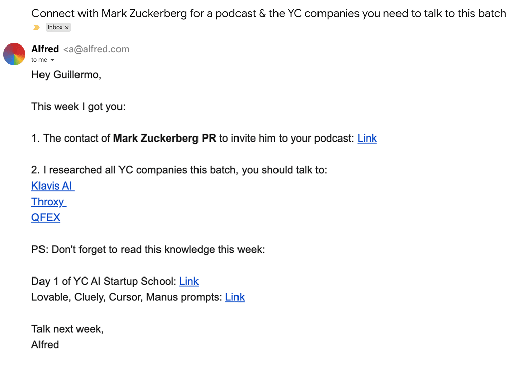 代理每周发送一封电子邮件(很快会变成每天发送并与日历相连),以帮助您:与您想要吸引的人(客户、人才、投资者、创始人)建立联系,并了解您的需求(人工智能、筹款、增长)。