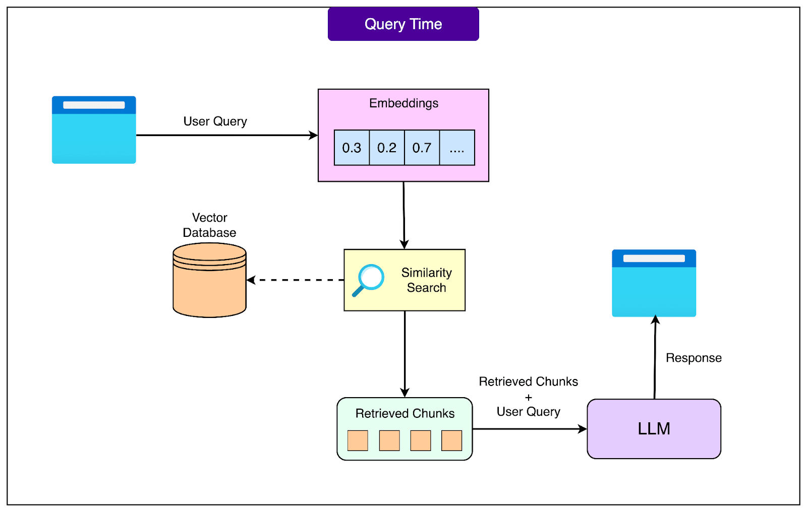 现在,查询以向量形式呈现,系统会在向量数据库中搜索最相似的文档块。这种相似性搜索速度很快,因为它使用数学运算而非文本比较。数据库可能包含数百万个块,但专门的算法可以在几毫秒内找到最相关的块。通常,系统会根据相似度得分检索出最相关的前 3 到 10 个块。
