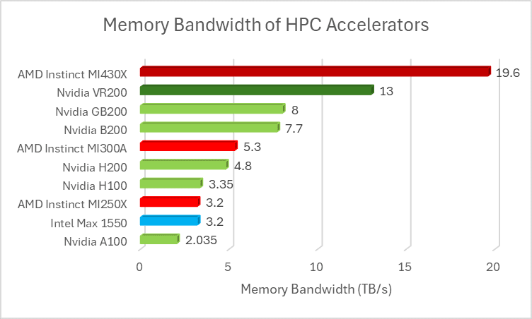 第一个优势是,MI430X 的带宽比 AMD 之前的产品要高得多,而且其内存带宽甚至比 Nvidia 即将推出的 Rubin 加速器还要高,这对于 HPC 中大量受限于内存带宽的任务来说非常重要。
