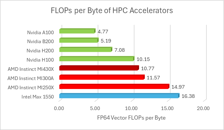 MI430X 将约 211 Teraflops 的 FP64 向量运算能力与 432 GB 的 HBM4 显存相结合,使其拥有 19.6 TB/s 的内存带宽;不出所料,这与 MI450X 的内存子系统相同。高性能计算 (HPC) 的一个重要指标是给定内存带宽下的计算量,通常用每字节浮点运算次数 (FLOPs per Byte,简称 F/B) 表示。对于许多 HPC 任务而言,其运算强度较低,因此较低的 F/B 值更受欢迎,因为大多数 HPC 代码都受限于内存带宽。