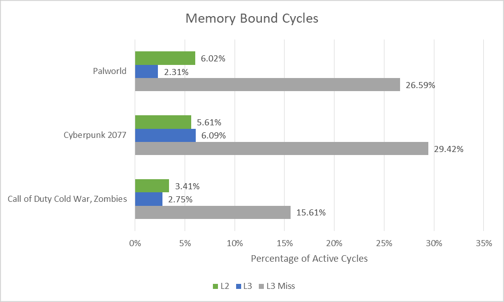 很大一部分退出停顿是由内存负载引起的,但令人惊讶的是,也有相当一部分是由其他原因引起的。这种方法与 AMD 的方法有所不同,因为退出停顿可能由于指令不完整以外的其他原因而发生。例如,在代价高昂的错误预测或异常之后,ROB 可能为空。不过,这些“核心绑定”的槽位仍然值得仔细研究。