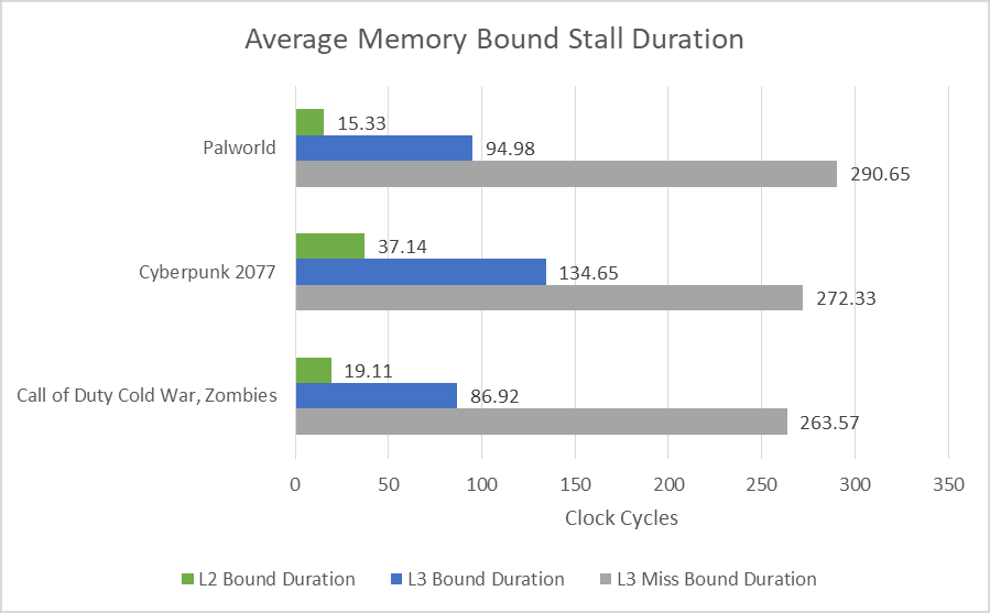 设置边沿位可以计算停顿发生的次数。将停顿周期数除以发生次数,即可得出平均停顿持续时间。这些数字很奇怪,因为平均停顿持续时间超过了 L2 和 L3 缓存的测量延迟。或许很多被阻塞的指令有多个来自指定缓存级别的输入。又或许,Skymont 可能使用与 Skylake 不同的标准来确定核心何时受内存限制。例如,它可能指示核心指令卡在等待来自指定内存层级的数据的时间,即使其他指令在此期间能够执行。