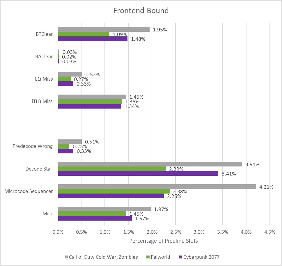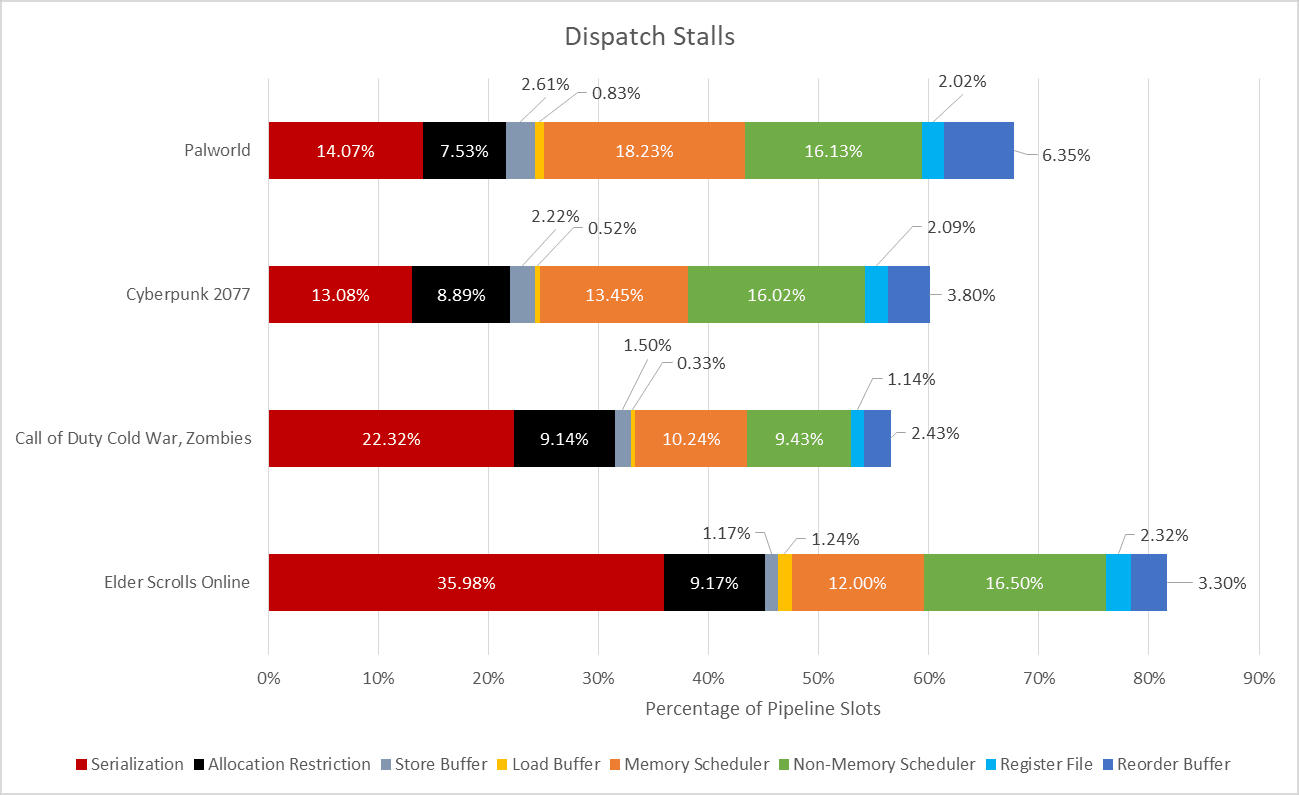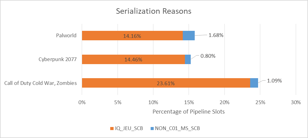 其他序列化情况很少见。C01_MS_SCB(上文未显示)统计了 UMWAIT 或 TPAUSE 指令将核心置于轻度 C0.1 睡眠状态的情况。NON_C01_MS_SCB 指向“微序列器 (MS) 记分板,它会暂停前端从 UROM 发出指令,直到指定的较旧微指令退出。MS 记分板最常执行的指令是 PAUSE”。这些暂停偶尔会出现,所以游戏可能正在将自旋锁与 PAUSE 指令一起使用。