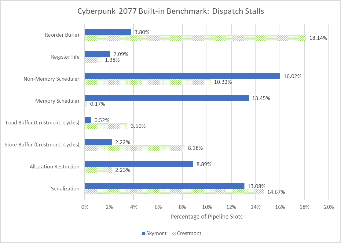 与其前身 Crestmont 相比,Skymont 以大幅提升的重新排序能力而著称。由于我的 Crestmont 安装在没有独立 GPU 的 Meteor Lake 笔记本电脑中,因此无法直接比较两者。但是,运行 Cyberpunk 2077 的内置基准测试以了解总体情况,结果表明 Crestmont 更容易达到其 256 个条目重新排序缓冲区的极限。Crestmont 上的其他限制因素仍然很重要,但与 Skymont 相比,资源停滞的原因已经有所改变。例如,Cresmont 很少耗尽内存调度程序条目,尽管非内存调度程序条目仍然感到压力。分配限制在 Skymont 上更成问题,可能是因为 8 宽的重命名/分配组更有可能包含更多发往同一调度程序的微操作。序列化在两个内核上仍然是一个问题。
