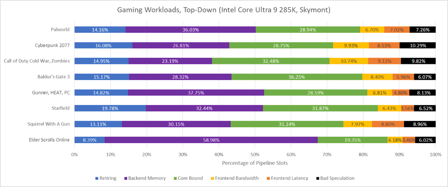 自上而下的分析通过查看重命名/分配阶段来解释核心宽度未得到充分利用的原因。它是流水线中最窄的阶段,这意味着在该阶段丢失的流水线槽会降低平均吞吐量。Skymont 经常受到后端限制,即重命名器有微操作需要发送到下游,但乱序的后端无法接收它们。Lion Cove 的情况类似,这并不奇怪,因为两个核心在 L2 之后共享一个内存子系统,而内存访问延迟经常导致后端限制损失。