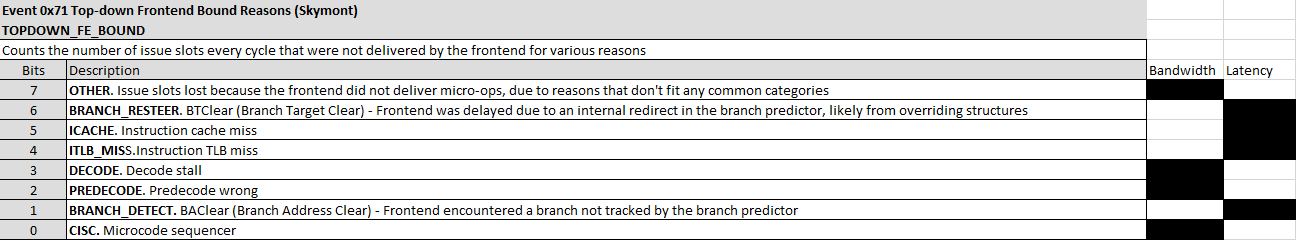 Skymont 没有事件或单元掩码来将后端绑定槽位分类为核心绑定槽位和内存绑定槽位。AMD 建议通过查看指令退出被负载阻塞的频率(相对于其他指令类型)来做到这一点。该方法可以在 Skymont 上粗略复制,它有一个事件,用于计算退出被负载阻塞时的周期数。设置 cmask=1 并反转退出槽位计数事件的位,可以提供退出停滞的总周期数。