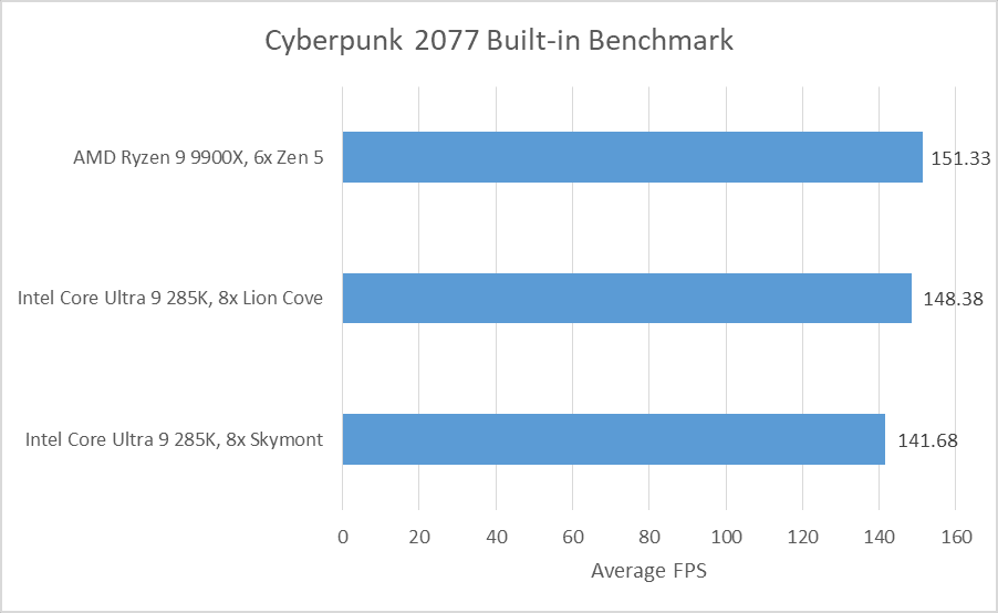 Skymont 可能并非 P 核心,也不具备极致性能。然而,主观上它在游戏中的表现不错。我在 Core Ultra 9 285K 上玩了各种游戏,并将亲和力设置为 16 个 E 核心。所有游戏都能够达到超过可玩帧率的水平,并且几乎没有卡顿或其他问题。它很好地展示了密度优化的核心在现代工艺节点上的性能,同时也凸显了追求极致性能时收益递减的问题。我认为,一款仅搭载 Skymont 核心的芯片单独来看应该会表现相当不错。