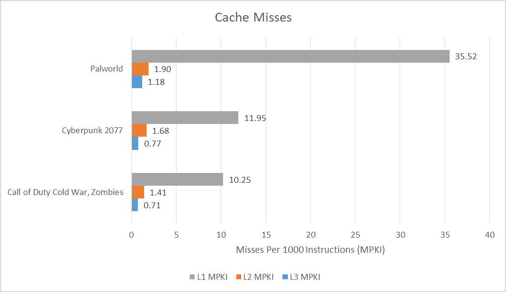 Skymont 的分支预测准确度在游戏中已经足够好了。我不会深入研究 Palworld 和《使命召唤》,因为我怀疑它们的误差幅度相当高。有趣的是,在《赛博朋克 2077》的内置基准测试中,Skymont 的预测准确度更高,每条指令的错误预测次数减少了大约 25%。