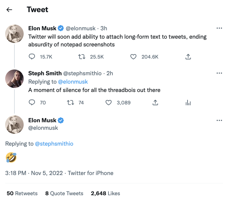 Steph Smith: 当Chief Twit 验证了您对线程的蔑视时? Posted on 2022-11-06 原推:When your disdain for threads is validated by Chief Twit ? https://twitter.com/stephsmithio/status/1589058236938096640