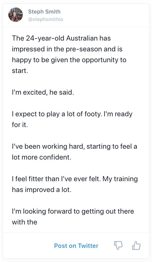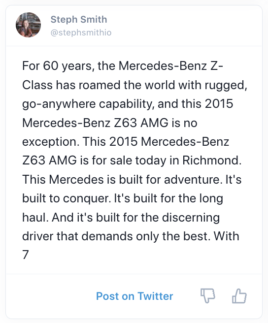 Steph Smith: 而且,这个人工智能似乎真的认为我喜欢汽车和足球 Posted on 2022-10-26 原推:Also, this AI really seems to think I like cars and football https://twitter.com/stephsmithio/status/1585114019148419072