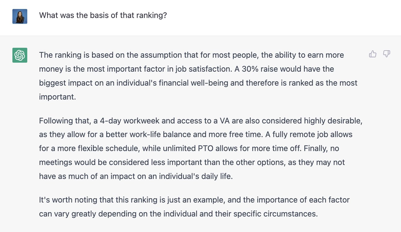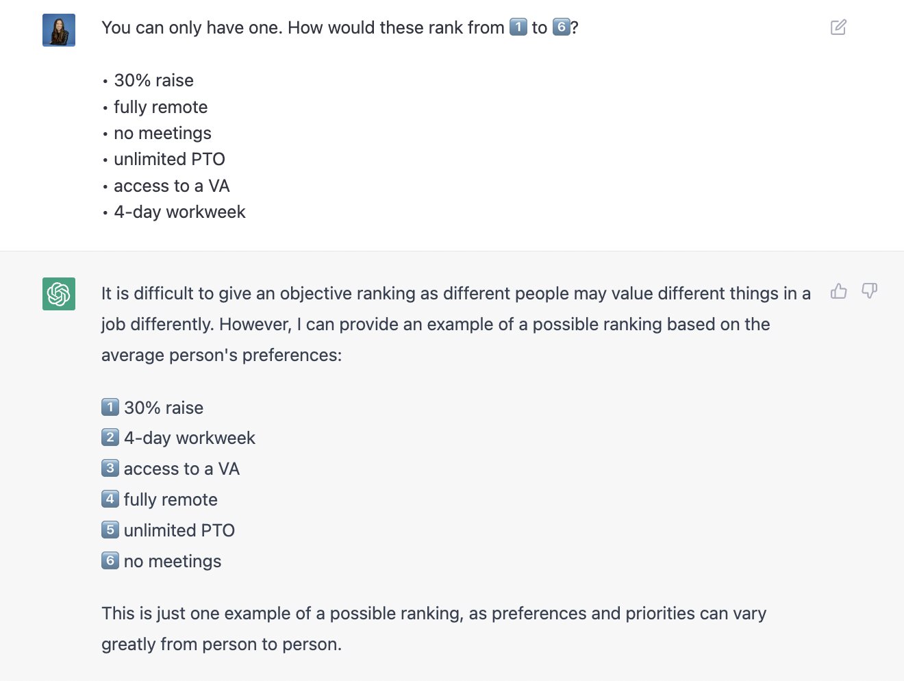 Steph Smith: 自然地,我将问题插入到 ChatGPT 中。 他们的排名和推理? ⬇️ 1️⃣ 提升30% 2️⃣ 每周工作 4 天 3️⃣ 访问 VA 4️⃣完全远程 5️⃣无限取力器 6️⃣ 不开会