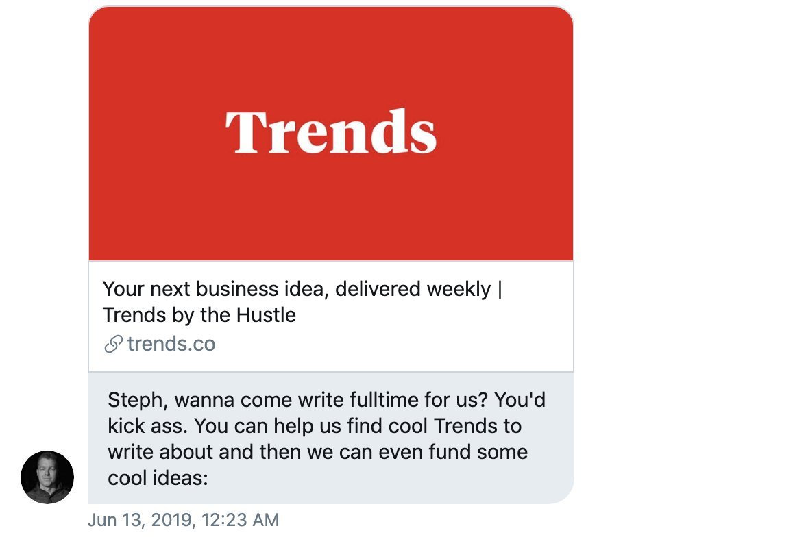 Steph Smith: @dennismuellr @TheHustle @HubSpot @thesamparr 他看到@garrytan 分享了我的一篇文章! 然后 DM 让我参与 Trends 的工作。 当时,我的追随者不到 3k。 https://t.co/iK5lOEgYlO 引用@thesamparr 的推文: @garrytan @stephsmithio 摇滚。她写作的超级粉丝。